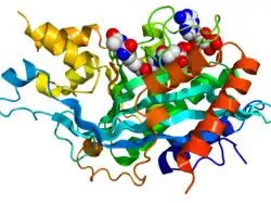 Crystallographic structure of the histone acetyltransferase domain of EP300 (rainbow colored, N-terminus = blue, C-terminus = red) complexed with the inhibitor lysine-CoA (space-filling model, carbon = white, oxygen = red, nitrogen = blue, phosphorus = orange).[1]