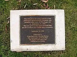 A memorial plaque honoring those who died on both planes and on the ground is located in the San Diego Aerospace Museum, near the Theodore Gildred Flight Rotunda in San Diego's Balboa Park. On the 20th anniversary of the crash, a tree was planted next to the North Park branch library, and a memorial plaque was dedicated to those who lost their lives. The library is not in the immediate vicinity of the actual crash site; it has been rebuilt and bears no visible evidence of the crash.[17]