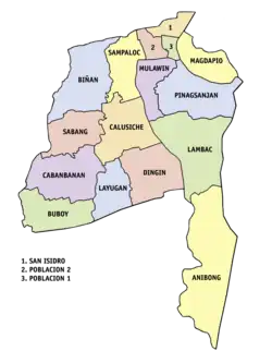 Pagsanjan is politically subdivided into 16 barangays, as indicated below and in the image herein.[19] Each barangay consists of puroks and some have sitios.