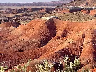 The desert is composed of stratified layers of siltstone, mudstone, and shale of the Triassic Chinle Formation, which erode easily. These fine-grained rock layers contain abundant iron and manganese compounds, which provide the pigments for the various colors of the region. Thin, resistant lacustrine limestone layers and volcanic flows cap the mesas. Numerous layers of silicic volcanic ash occur in the Chinle and provide the silica for the petrified logs of the area. The erosion of these layers has resulted in the formation of the badlands topography of the region.[5][6][7]