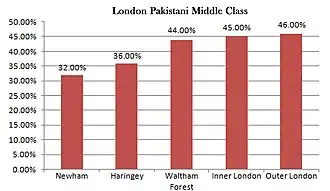 As of 2001, almost equal amounts of Pakistanis in Inner (45%) and Outer London (46%) were middle class.[10]