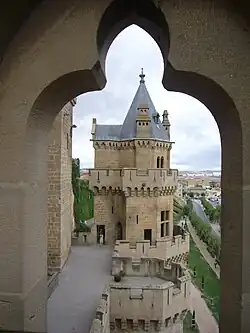 (The Four Winds's tower or the Big Three Finestras's tower) So named because of its square structure looming three balconies, each facing a cardinal point. From these balconies the kings could watch the shows that were held at the foot of the castle. Adjoining the tower is a small tower with a square base and higher. Both towers located very close to each other, are in the most remote area of the castle, on its south side. In this place could be found another garden, the Jardín del Cenador, that today has disappeared.