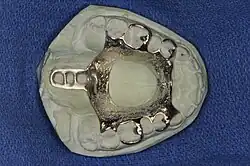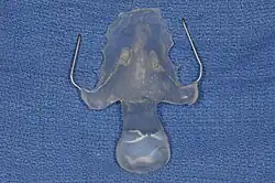 A palatal lift prosthesis is a prosthesis that addresses a condition referred to as palatopharyngeal incompetence. Palatopharyngeal incompetence broadly refers to a muscular inability to sufficiently close the port between the nasopharynx and oropharynx during speech and/or swallowing. An inability to adequately close the palatopharyngeal port during speech results in hypernasalance that, depending upon its severity, can render speakers difficult to understand or unintelligible.[1] The potential for compromised intelligibility secondary to hypernasalance is underscored when consideration is given to the fact that only three English language phonemes – /m/, /n/, and /ng/ – are pronounced with an open palatopharyngeal port.[2] Furthermore, an impaired ability to effect a closure of the palatopharyngeal port while swallowing can result in the nasopharyngeal regurgitation of liquid or solid boluses.