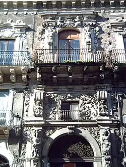 The Palazzo San Demetrio is a late-Baroque style palace located at via Etna #55, where via Etna intersects Via San Giuliano, in the city center of Catania, region of Sicily, Italy. The palace is remarkable for its highly sculptural portal.