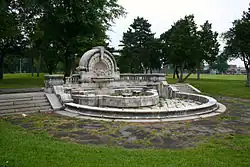 The Merrill Fountain was designed by the architectural firm of Carrère and Hastings and originally stood in front of the old Detroit Opera House in Campus Martius Park. Built in 1904 at a cost of US$1,000,000 (equivalent to $34,996,296 in 2024),[5] it was named for Charles Merrill and dedicated by his daughter, Elizabeth Palmer.[4][14][15] As automobile traffic increased in downtown Detroit, the city's elders decided to move the fountain to the Merrill Plaissance, at the far southern boundary of Palmer Park, in 1926.[16] The fountain functioned for one season in the park and then pipes broke.[6] It has been dry for over 50 years and suffered from theft of pieces and destruction by vandals.[17]