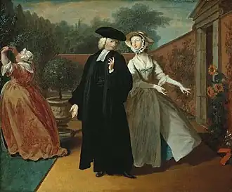 The book was already a popular one for painters - the younger artist Francis Hayman had produced designs for Gravelot's engravings for the 1742 edition[1] as well as a pair of scenes from the novel for Vauxhall Gardens, also around 1742[2] (one is lost and the other is now in the National Trust's collections at Sizergh Castle[3]). Highmore painted his series of twelve works between 1741 and 1743 and on 16 February 1744 advertised that ten of them were ready to be viewed at his studio, with another advertisement on 10 May announcing that all twelve paintings in the set were complete. The first advertisement also stated he was taking subscriptions for a set of twelve engravings after the novel[4] — Highmore had Louis Truchy and Antoine Benoist produce them.[5][6]