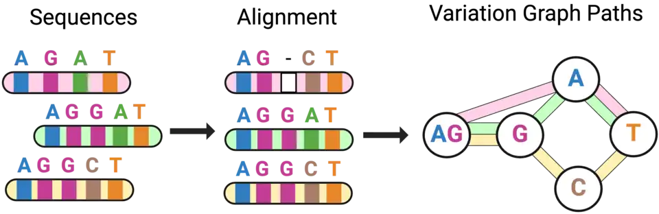 Variation graphs (also known as sequence graphs) represent sequence homology and variation at the nucleotide level in a graph structure. In a variation graph model, nodes represent contiguous sequences (such as a reference segment or an allele sequence), and edges connect nodes to indicate allowed adjacencies in some genome. The graph can be viewed as a merger of many individual genomes: each genome corresponds to a path that traverses the nodes in the order of its sequence.[3] Unlike de Bruijn graphs, which are derived from fixed-length kmers, variation graphs are often derived from alignments or variant catalogs. For example, one can start with a reference genome and add alternate alleles as divergent branches at variant sites, or perform a multiple sequence alignment of several genomes and build a graph that embeds that alignment.[2] Variation graphs accurately capture SNPs, indels, and structural variants, and they enable a complete, lossless representation of entire genomes, a relevant feature for clinical genomics. Nevertheless, graph complexity grows rapidly with the addition of haplotypes, and most implementations offer limited support for dynamic updates.[17] Some applications include the Human Reference Pangenome and pathogen variant calling that integrates both SNPs and SVs. [2][18] Tools like pggb and Minigraph enable chromosome-scale human pan-genomes.[19]