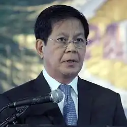 On March 24, Lacson resigned as chairperson and member of Partido Reporma a few hours before the party's leaders endorsed the presidential bid of Vice President Leni Robredo.[7] Reporma's president, Representative Pantaleon Alvarez, praised Lacson's experience in government and called him the "most qualified" to be the next president of the Philippines. However, Lacson's poor performance in pre-election opinion polls forced the party to consider another candidate.[8] Lacson announced that he "harbor[s] no ill-feelings" towards his former party, and would continue his presidential bid as an independent candidate.[9] However, on official ballots, Reporma will still be indicated as his affiliation based on the certificate of candidacy he filed in October 2021.[10] On the following day, Lacson claimed that Reporma's withdrawal of support "was actually more about the issue of campaign expenses." Lacson disclosed that Alvarez's chief of staff requested him for ₱800 million to fund the party's campaign, an amount he was unable to produce. Alvarez denied Lacson's accusation, asserting that the party "can very well fund its own candidates," but admitted that the issue of funding was a major consideration in their change of support. Robredo's team also denied giving ₱800 million to Reporma in exchange for their support. Meanwhile, Partido Reporma founder and chairman emeritus Renato de Villa would continue to support Lacson.[11][12]