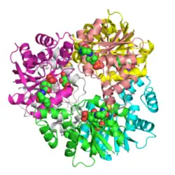 ![]() Phosphopantetheine adenylyltransferase from Thermotoga maritima. 4'-Phosphopantetheine shown as spheres. PDB 1vlh | |||||||||