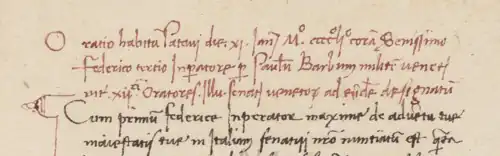 The first of these was delivered on 11 January 1452 on the occasion of his embassy to the emperor at Padua. It is preserved in four Italian manuscripts. Barbo implicitly recognizes the universal power of the emperor and ends by paying homage to the empress, Eleanor of Portugal.[7] The second was delivered at Brescia in 1455 when he and Giovanni Moro handed command of the army to the condottiere Bartolomeo Colleoni. Only an excerpt survives and the manuscript labels it an oratiuncula. The third speech was delivered before King Louis XI of France at Tours on 8 December 1461, during his embassy.[2] It was edited by Agostino Valier and published in 1719.[1]