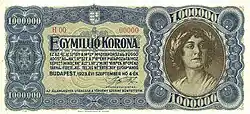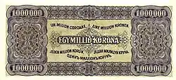 After 25 August 1926 the 1,000 to 1,000,000 korona banknotes were overstamped to show the value in pengő (at the rate of 12500 korona to 1 pengő).