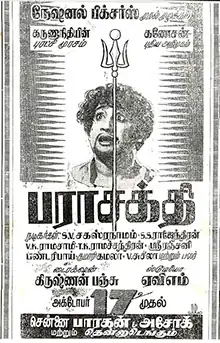 K. Hariharan, the director of L. V. Prasad Film Academy in Chennai, included the film in his 2013 list, "Movies that stirred, moved & shook us".[76] According to Film News Anandan, after Parasakthi, Ganesan "became the dominant icon of the DMK", replacing K. R. Ramasamy.[77] Historian S. Muthiah said that Parasakthi "showed Karunanidhi as the master of meaningful screen dialogue that carried forceful messages to the masses".[78] In 2017, Kamal Haasan included the film in his list of 70 favourite movies, stating "This film changed the texture of society. A star was born – the ease with which Sivaji Ganesan walked through the film! His peers paled into insignificance. The writer was Karunanidhi. It was a film about social anger. I saw it much later; I understood it only then."[79]