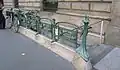 Rather than stone, Guimard used cast iron set in concrete both to reduce costs and to suit the sinuous Art Nouveau forms;[3][6] they were painted in a green emulating weathered brass.[7] (For a renovation that began in 1999, the RATP, the Paris transportation authority, restored the entrances to two slightly different shades: at sites with a lot of vegetation, vert wagon ('train-car green'), the dark green used for Parisian public works at the turn of the 20th century, and at fully urban sites, a slightly bluer shade, vert allemand ('German green').[8]) He designed standardized components, including railing cartouches incorporating the letter "M" and signs in his own distinctive lettering reading "Métropolitain" or, at narrow entrances, "Métro"; later the use of the lettering was extended to a holder for a system map and for advertising (porte-plan) with the station name above. In addition to speed (the first set of entrances were installed within six months of their design)[9] and relatively low cost in manufacture and adaptation to different sizes and locations of entrances, all of this gave the system a stylistic identity.[6][10]