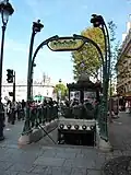Three of the entrances took the form of free-standing pavilions or small stations,[5] including waiting rooms: one at Bastille and two on Avenue de Wagram at Étoile. These were in a style influenced by Japanese pagodas. At Étoile Guimard provided exterior doors for elevators, although the elevators were not built.[10] Eight simpler but still elaborate structures, labeled "Édicule B" by Guimard, were installed at the termini of Line 1 as originally opened and at two other major stations. These consisted of three-sided glass-roofed structures enclosing the stairway, with a projecting canopy.[10][11][12] A variation on this format, "Édicule A", lacked the canopy and was erected at two stations, Saint-Paul and Reuilly – Diderot.[10] These édicule types of entrance, which have come to be called libellules because they resemble dragonflies, in some cases had decorated wall panels surfaced in reconstituted lava.[11] The great majority of the entrances built (154) were unroofed enclosures, dubbed an entourage. A transitional form between the entourage and the édicule, railings with a roof and canopy, was used for one entrance at the Gare de Lyon métro station.[13]