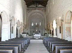 In the eastern wall, there are three apses, a central major one, where the altar is now located, and two minor ones on either side. The western area is lit by the three single-lancet windows in the major apse and the two inserted in each of the minor ones. Next to the north-facing wall is a sculpture of the Madonna surrounded by four saints, in Gothic style and made of stucco. In the center of the major apse is a small door leading to the niche where the chrism for baptisms is kept, while to its left is a small late Gothic tabernacle.[21]