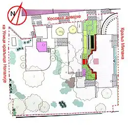Across the Kralja Milana street are located two former Royal courts: Stari Dvor, former residence of the Obrenović dynasty which is today seat of the Belgrade City Hall and Novi Dvor, former residence of the Karađorđević dynasty, present seat of the President of Serbia. Below the park are Belgrade’s Mathematical Gymnasium, The Russian House - Russian Centre of Science and Culture and Nikola Tesla School for Electrical Engineering (former Higher School for Girls).[1][2][3] Before the girls' school was built as a donation by the Queen Maria, there was a chapel on the location, dedicated to the Saint Natalia of Nicomedia.[7]
