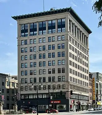 The Park Building is an historic building in Worcester, Massachusetts, USA. Built in 1914, the 11 story structure was for many years one of Worcester's most prominent landmarks. It has a steel frame, with an exterior that is dressed predominantly in limestone. The first two floors have metal and plate glass store fronts, while the third floor has evenly spaced windows, separated by decorative limestone panels and topped by a cornice. From the fourth to the ninth floors there is little decoration. The top two floors have groups of windows separated by Tuscan columns, giving the appearance of a loggia.[2]