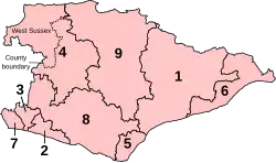 The ceremonial county of East Sussex, (which includes the unitary authority of Brighton & Hove) is divided into 9 parliamentary constituencies - 4 borough constituencies and 5 county constituencies, one of which crosses the county border with West Sussex.