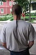 Hair that has been grown out long and shorn, or 'buzzed' except for a long, thin braid at the very top of the neck. |