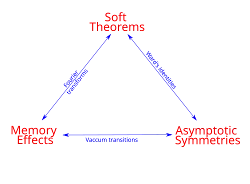 The connections are among weak and lasting effects caused by the passage of gravitational or electromagnetic waves (memory effects), quantum field theorems on graviton and photon and geometrical symmetries of spacetime. Because all of this occurs under conditions of low energy, known as infrared in the language of physicists, it is also referred to as the infrared triangle.[2]
