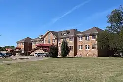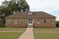 This is the oldest building in the district, having been constructed in 1876. The Superintendent's Building was unoccupied at the time of the NRHP application, when reported some significant structural damage parts of it. Originally built as an office and residence for the Indian Agent, it became the office and residence for the school superintendent around the turn of the 20th century, giving it its current name.[8] It is a two-story structure, built in Queen Anne style, of cured ashlar sandstone. It has a wrap-around porch supported by wooden columns which rest on stone piers. This is not the original porch, but a replacement constructed in 1916. A porte-cochere was added to the west side of the building sometime after 1916. The building also has a front-facing gable and a side-facing gable There is a kitchen with a shed roof on the south side and a hip-roofed room in the L-shaped space formed by the kitchen and the side-facing gable wing. Both of these additions are roofed with green composition shingles, while the main building has asbestos shingles. Originally, these structures had wood-shingle roofs.[8]