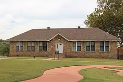 Built in 1927, the Employee Quarters and Guest Building contained two classrooms and an office for the school's principal. After all classes later moved into the 1932 School Building, this structure was remodeled to serve as employees' apartments. After the school closed, the building was converted to a fitness center for the Pawnee tribe. This is also a rectangular, quarry-faced, Ashlar stone building that has a hipped roof. A gable placed centrally over the front door (east side) breaks up the horizontal roofline. The original door was much larger than the present modern door, and the original door opening has been filled in to suit the change. The building has been assessed as "one of the most (structurally) sound on the campus."[8]