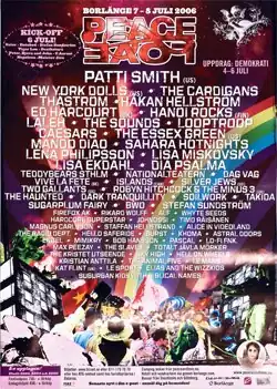 Over the years, artists such as Patti Smith, New York Dolls, Vitalic, Jay-Z, Tech N9ne, Lily Allen, Them Crooked Vultures, Alice Cooper, Slayer, W.A.S.P., Surkin, NOFX, Ed Harcourt, Vive la Fête, Hanoi Rocks, Motörhead, Cut Copy, and Khonnor, Familjen, Rootvälta, Den Svenska Björnstammen, Miike Snow, Name The Pet, The Cardigans, Thåström, Håkan Hellström, The Sounds, Mando Diao, Lars Winnerbäck, Ulf Lundell, The Hives, Looptroop, The Hellacopters and Silverbullit, among many others. The band which has played the most often at the Peace & Love festival is Sugarplum Fairy, a rock band from Borlänge whose two singers, Carl and Victor, are younger brothers of Gustaf Norén from the better-known band Mando Diao, also a rock band from Borlänge. Sugarplum Fairy has played every year since 2001.