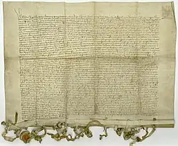 The (First) Peace of Thorn was a peace treaty formally ending the Polish–Lithuanian–Teutonic War between allied Kingdom of Poland and Grand Duchy of Lithuania on one side, and the Teutonic Knights on the other. It was signed on 1 February 1411 in Thorn (Toruń), one of the southernmost cities of the Monastic State of the Teutonic Knights. In historiography, the treaty is often portrayed as a diplomatic failure of Poland–Lithuania as they failed to capitalize on the decisive defeat of the Knights in the Battle of Grunwald in June 1410. The Knights returned Dobrzyń Land which they captured from Poland during the war and made only temporary territorial concessions in Samogitia, which returned to Lithuania only for the lifetimes of Polish King Władysław Jagiełło and Lithuanian Grand Duke Vytautas. The Peace of Thorn was not stable. It took two other brief wars, the Hunger War in 1414 and Gollub War in 1422, to sign the Treaty of Melno that solved the territorial disputes. However, large war reparations were a significant financial burden on the Knights, causing internal unrest and economic decline. The Teutonic Knights never recovered their former might.