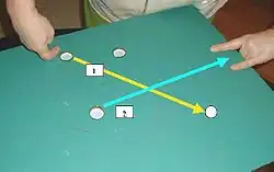 While varieties of the game exist, the core game mechanic is usually the same: players have three coins on the table in a triangle, and try to flick one of the coins in-between the other two, creating another triangle; the player whose turn it is gets to repeat this as long as the coin they touched crosses the line between the other two coins and stays on the table, or some sort of point is scored. Variations may also force a player forfeit their turn if the coin being flicked hits another coin, as well as the ability to ricochet the flicked coin off by placing the other hand on the table with the fingernails facing outwards.