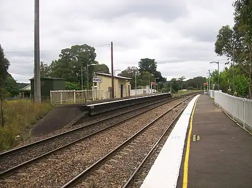 Penrose railway station is located on the Main Southern line in New South Wales, Australia. It serves the village of Penrose opening in 1869 as Cables Siding being renamed Penrose on 1 June 1871. It was relocated to its present site on 15 March 1916.[5] Another station, Kareela, once existed between Penrose and Bundanoon.[6]