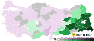 The HDP first participated in the 2014 local elections, where it ran in most provinces in western Turkey while the DBP ran in the Kurdish south-east. The two parties combined gained 6.2% of the total votes but HDP failed to win any municipalities. The 21 MPs from the Peace and Democracy Party, the predecessor of the DBP, joined the HDP on 28 August 2014.[38] For the June 2015 general election, the HDP took the decision to field candidates as a party despite the danger of potentially falling below the 10% threshold. Even though most of the politicians from HDP are secular left-wing Kurds, the candidate list included devout Muslims, socialists, Alevis, Armenians, Assyrians, Azerbaijanis, Circassians, Lazi, Romanis and LGBT activists. Of the 550 candidates, 268 were women.[39][40][41] In 2015, Barış Sulu was the first openly gay parliamentary candidate in Turkey as a candidate of the HDP.[42] Support for the HDP among Alevis rose from 7% to 16% between June 2015 and June 2018.[43]