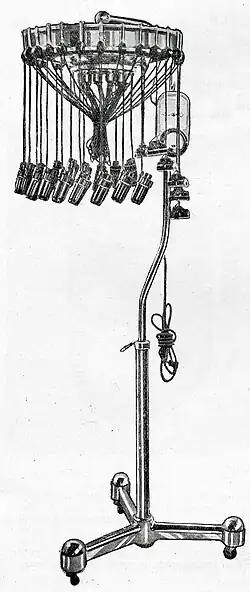 Apart from portable models which became available later, some system of support was necessary for the curlers. At first these were fixed to the ceiling, but these were soon replaced by a machine that was universally adopted. A vertical metal pipe held a circular unit, called a "chandelier" from which the heaters were suspended. The bottom of the pipe was mounted on a base with wheels which enabled the device to be moved easily between clients or to one side of the salon. By providing a structure from which to distribute the electricity to the heaters, as well as to keep all of them in the correct position and orientation, the chandelier helped minimize the weight of the entire system while also keeping things tidy.