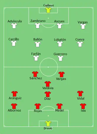 42. ^ "Perú cayó 2-1 ante Chile con 10 hombres y jugará por el tercer puesto de la Copa América 2015" [Peru fell 2-1 to Chile with 10 men and will play for third place in the 2015 Copa América]. Peru21 (in Spanish). 2015-06-30. Retrieved 2022-11-03.