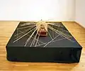 After the Postoj, Kalmus participated at many art exhibitions in Slovakia and abroad.[5] Kalmous considers creating art to be his lifestyle.[6] His work reflects the public obsession with consumerism as well politics, death, religion, sports.[7] He has several long-running projects, including the cycles Partitúry (Scores) and Korózne grafiky (Corrosive Prints). Perhaps his well-known long-term project has consisted of wrapping a wire around at least one stone every day between 1998 and 2022, representing the 70 000 Jews deported from Slovakia by the fascist Slovak Republic during the World War II.[3] A Peter Kalous' Holocaust monument, consisting of four glass tubes filled with the wire-wrapped stones, was first uncovered in 2016 by the President of Slovakia Andrej Kiska. It is located in a renovated synagogue in the town of Lučenec.[8]