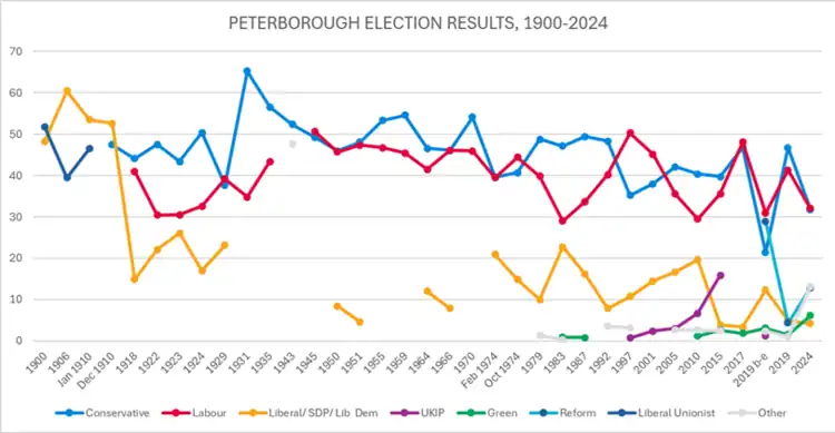 From the formal merger of the breakaway Liberal Unionists with the Conservatives in 1912 and the absorption of rural North Northamptonshire in 1918, Peterborough has been predominantly Conservative; however, it has elected Labour MPs several times from 1929 onwards.