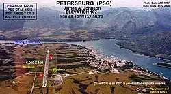 Petersburg James A. Johnson Airport (IATA: PSG, ICAO: PAPG, FAA LID: PSG) is a state owned, public use airport located one nautical mile (2 km) southeast of the central business district of Petersburg, a city in the Petersburg Borough of the U.S. state of Alaska that has no road access to the outside world.[1] Airline service is subsidized by the Essential Air Service program.