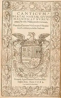 - ^ KU Leuven Libraries Special Collections, RC81 (1563). "Canticvm beatæ Mariæ qvod magnificat nvncvpatur, per octo musice modos variatum., Francisco Guerrero musices apud Hispalensem ecclesiam præfecto authore".