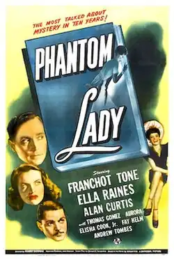Phantom Lady is a 1944 American film noir directed by Robert Siodmak and starring Franchot Tone, Ella Raines, and Alan Curtis.[1][2] Based on the novel of the same name by Cornell Woolrich,[1][2] it follows a young Manhattan secretary and her endeavors to prove that her boss did not murder his wife.