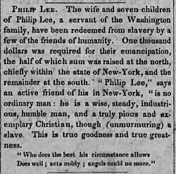 Philip Lee's story was mentioned in the Genius of Universal Emancipation abolitionist newspaper in January 1830, in a regular column called "The Blacklist."[19] The newspaper was edited by Benjamin Lundy, the column may have been written by a bold young writer named William Lloyd Garrison.[20] The topic of the article was the increasing number of American slave ships departing from Virginia seaports and the moral consequences of family separation in American slavery.[19]