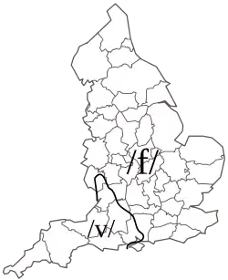 Initial fricative voicing is a process that occurs in some traditional accents of the English West Country, where the fricatives /f/, /θ/, /s/ and /ʃ/ are voiced to [v], [ð], [z] and [ʒ] when they occur at the beginning of a word. (Words beginning /θr/, like three, develop /dr/ instead.) In these accents, sing and farm are pronounced [zɪŋ] and [vɑːɻm]. The phenomenon is well known as a stereotypical feature, but is now rare in actual speech.[8] Some such pronunciations have spread from these dialects to become standard usage: the words vane, vat and vixen all had initial /f/ in Old English (fana, fæt, fyxen).[9]