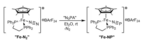 Cummins and co-workers exploited their N3PA free PN releasing reagent to "trap" and isolate a stable terminal (dppe)(Cp*)Fe-NP complex as a BArF24 salt. The NP bond length in this case was very short at 1.493(2) Å, almost unperturbed from gaseous PN, which is consistent with minimal pi-backbonding from the iron center. Studies confirmed the NP binding mode (as opposed to PN) to be energetically preferred by 36.6 kcal/mol (153 kJ/mol) in this iron complex, creating a significant barrier to isomerization (thought to arise from Pauli repulsion effects).[42] Studies of phosphorus mononitride chemistry at tris(amido) vanadium complexes undertaken by Cummins and coworkers provides the bulk of PN reactivity examples at transition metals to date. In this system, PN is synthetically generated at a vanadium center from respective dibenzo-7λ3 -phosphanorbornadiene derivative precursors. However, it is not stable as a terminal ligand, and instead immediately undergoes trimerization. Notably, a thermodynamic equilibrium exists between this trimer species, along with a dimer and non-observed monomeric intermediate fragment.[4][50]