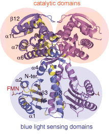 Structure of the photoactivated adenylyl cyclase OaPAC forming a homodimer. FMN: flavin mononucleotide, the light-absorbing pigment. [1]
