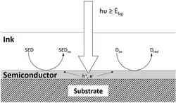 Photocatalyst activity indicator inks are a recent advance in the visual demonstration of photocatalysis and the assessment of the activity of photocatalyst materials.[15][25] They are inexpensive, easy to use and provide a very quick route to demonstrating the presence of a photocatalytic film, even under low levels of UV light. Unlike the photo-oxidative bleaching of methylene blue,[22] they use the underlying semiconductor photocatalyst film to photoreduce the dye (Dox in figure 2), in the ink coating, to another (usually colourless) form, (Dred in figure 2) whilst simultaneously oxidising an easily oxidised organic species, a sacrificial electron donor (SED), such as glycerol, which is also present in the ink.[15][25][26] The kinetics of reduction of the dye in a paii have been studied in great detail.[27][28] Figure 2 illustrates the basic principles of operation of a paii when applied to a product that has a thin photocatalyst film coating.