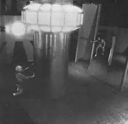 While primitive compared to technology today, entailing wearing 15 pounds of battery packs and equipment, Photon was one of the first video game-like experiences that one could play in the real world.[1] The arenas featured multiple levels, catwalks, mazes, and an observation deck where people not participating could cheer on their friends in the game, or get target practice by shooting players from special token-operated emplacements. Shots from observation deck guns did not affect the game in any way at most arenas. This contrasted sharply with competing laser-tag centers, whose fields were small, single-level, composed of clusters of free-standing painted cardboard barriers, and typically contained no observation area of any sort. Also, in Photon, players were allowed to roam at will through the entire playing field rather than be restricted to team-specific zones.