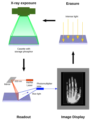 Projectional radiography using a photostimulable phosphor plate as an X-ray detector can be called "phosphor plate radiography"[1] or "computed radiography"[2] (not to be confused with computed tomography which uses computer processing to convert multiple projectional radiographies to a 3D image).