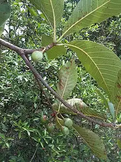 The Phulwara is a medium-size deciduous tree with a straight trunk. It typically attains a height of 15 to 22 meters and a girth of 1.5 to 1.8 meters. In the Andaman Islands it can reach a height of 21 to 36 meters and a girth of 1.5 to 2.4 meters. In the hills of Kumaun, the tree attains a girth of 3 meters. The bark is dark grey or brown.[1] The tree typically begins to yield fruits after five to nine years, reaching full potential in about fifteen years. It can yield fruits for fifty to sixty years.[2]