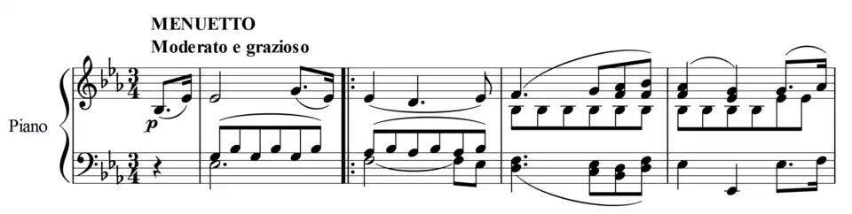 The third movement is the most serious of the movements, with a sweet and tender nature. The minuet and the trio are in E♭ major.