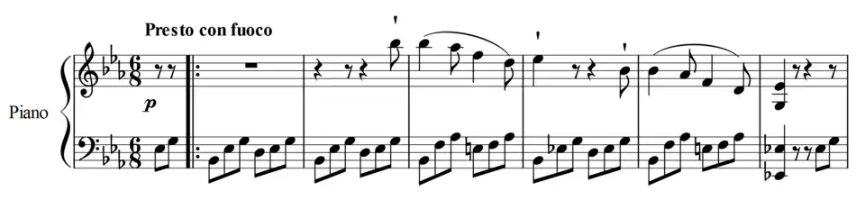 The Piano Sonata No. 18 in E♭ major, Op. 31, No. 3, is an 1802 sonata for solo piano by Ludwig van Beethoven. A third party gave the piece the nickname "The Hunt" due to one of its themes' resemblance to a horn call.[1] Beethoven maintains a playful jocularity throughout much of the piece, but as in many of his early works, the jocular style can be heard as a facade, concealing profound ideas and depths of emotion.