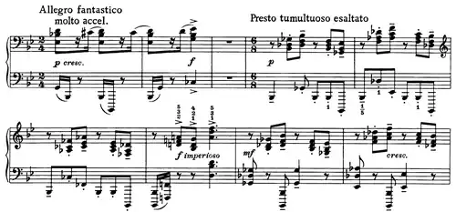 | 3 | 227–270 | The next section features materials derived from the coda and the introduction. First, the presto tumultuoso esaltato is developed. The trills theme is briefly quoted(mm. 247–250). Then, the languido theme is mocked (mm. 251ff.). | ||