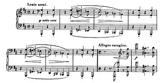 4 to Alla breve, and the second theme marked Allegro energico, consisting of a jagged, forceful motif in octaves, is introduced.[23] This is quickly followed by the third theme, which Liszt characterize as Hammerschlag ('hammer-blow') to describe the single note repetition in the theme.[24] A dialogue ensues, with mounting energy, until reaching the noble Grandioso material in D major. Liszt transforms the "hammer-blow" motif into a grand melodic gesture masked cantando espressivo.[25] The slow movement, an Andante sostenuto in F-sharp major, is the centerpiece of the Sonata. This fully-fledged movement, in compound ternary form, features, in quick succession, a number of themes heard earlier in the Sonata in a tour de force of thematic economy.[26]
